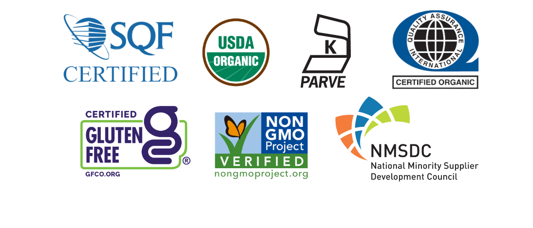 CertificationsHACCP, Organic, Non-GMO Project Verified, QAI, Kosher, Gluten Free, Southern California Minority Business Development Council, plus we follow GFSI guidelines